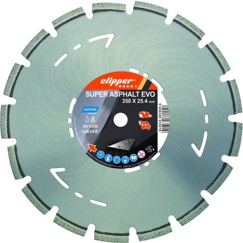 Произведенный с использованием технологии лазерной сварки диск обладает хорошим соотношением цена/качество, длительным эксплуатационным ресурсом и высокой скоростью резки при работе с асфальтом и абразивными материалами ("сухая" и "влажная" резка). Имеют особый запатентованный индикатор глубины резания в виде перфорированных стрелок на корпусе. Также, для защиты от подрезания сегментов используется технология "наклонного сегмента". Производится в диаметрах 300 - 600 мм. Применение: асфальт, асфальт на бетонном основании, свежий бетон и абразивные строительные материалы. Производитель: Norton Clipper (Нортон Клиппер) Стоимость алмазных дисков SUPER ASPHALT EVO: